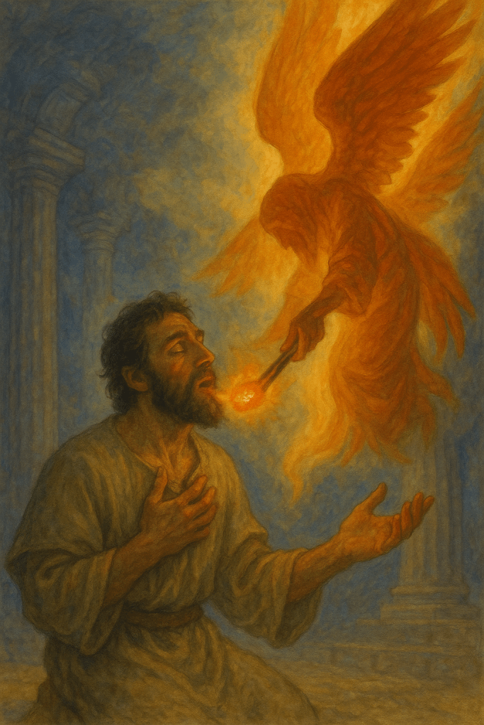 旁白:因為王命緊急,火窯非常炙熱,抬人的壯丁都被火焰燒死。但三個年輕人卻沒有被燒死,王反而看見火中有第四個人與他們同在。