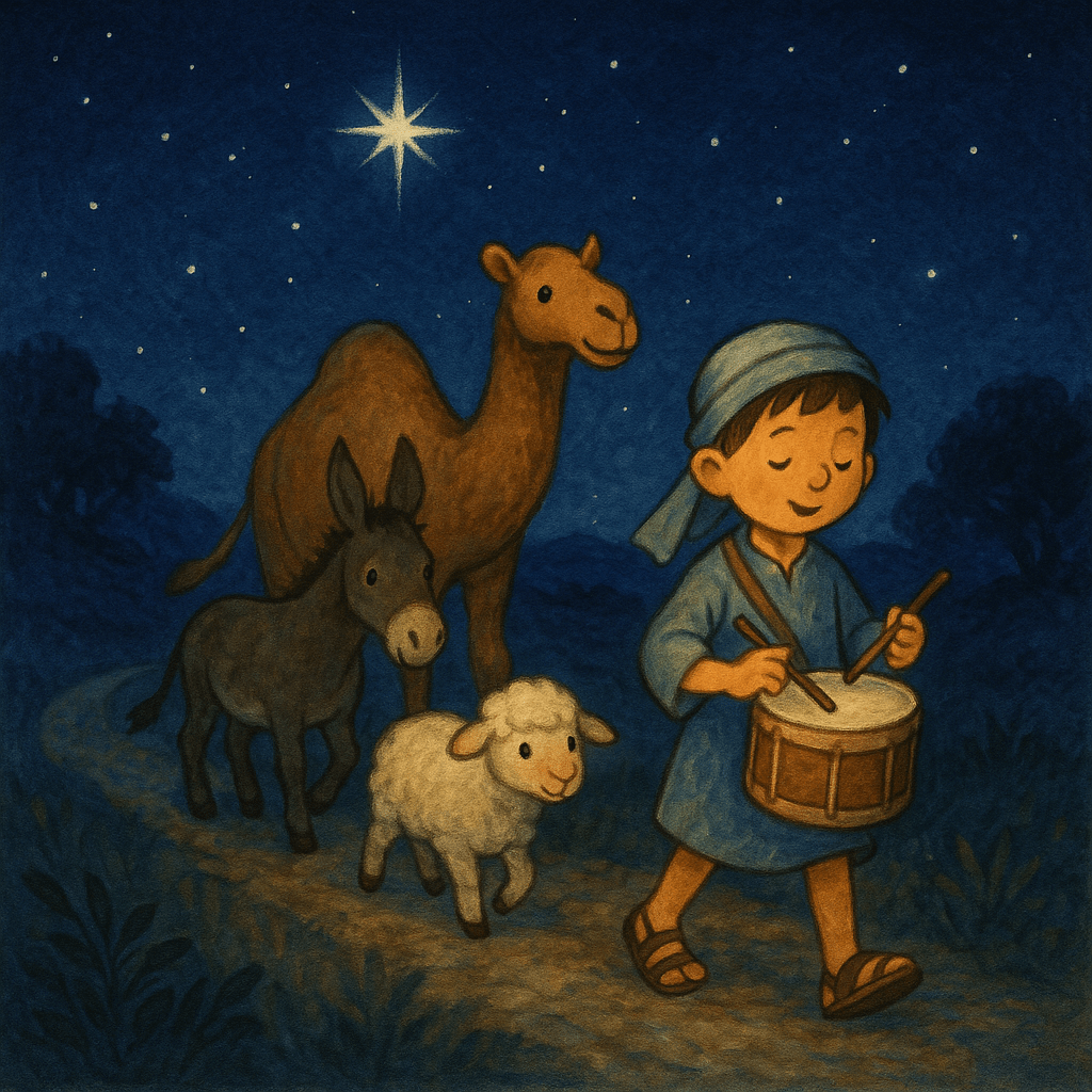 亞倫抬頭,看見馬槽裡那個安靜的小嬰兒。四周喧囂,他卻那麼平安。亞倫心裡的風暴,在那一刻稍微靜下來。他看見別人手裡都有禮物:有貴重的金屬,有芬芳的香料,有長途跋涉的辛勞。他低頭看看自己,發現一無所有——只剩下一面小鼓。
