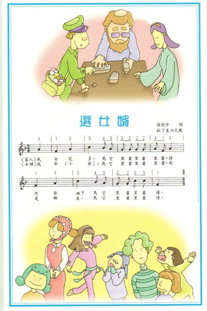 - 唱歌:《選女婿》全班合唱,引導者請三位幼兒各持 FAC’ 音磚為獨唱部分伴奏。